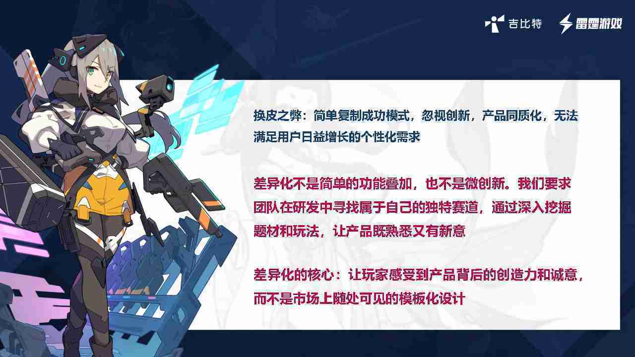 在我们内部是这么定义差异化的。。。。首先,,,差异化不是简单的功能叠加,,更不是换皮。。只是换皮,,产品无法提供有效的市场价值。。内部经常说差异化的产品不是为了迎合市场,,而是找到一个自己独特的表达方式,,,在研发中找到属于自己的细分赛道和独特赛道,,,,前提是需要对这个题材有足够的深入、、、、挖掘,,,,对玩法有足够深入的理解,,,,让产品看起来既熟悉又有新意。。。。