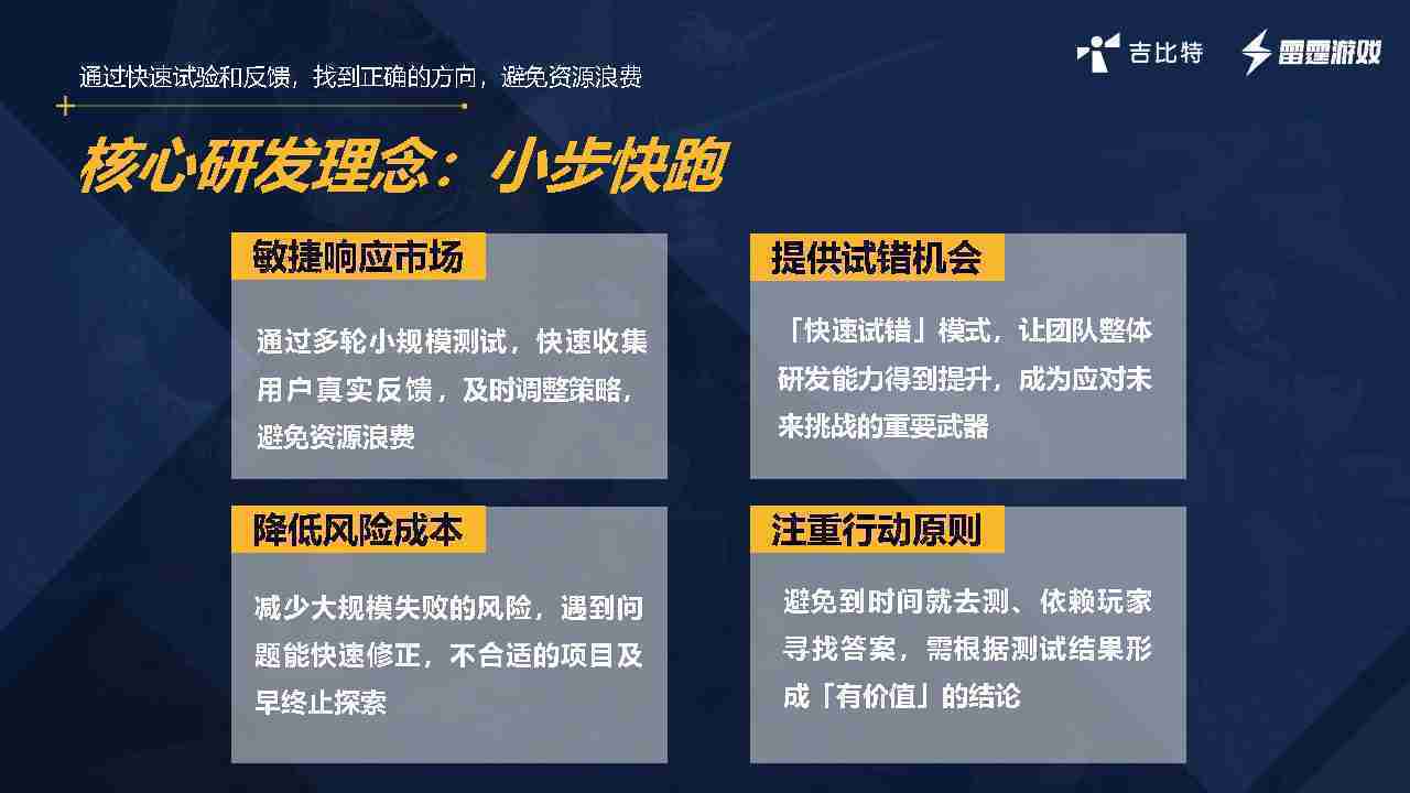 从目前的实践来看,,内容向确实不合适,,,因为小步快跑更适合做玩法的尝试,,,,但是如果是内容项,,玩法已经确定的,,,,这时候应该做切片,,而不是做小步快跑的方式,,,因为做切片的成本是很高的。。。我们有过两个项目,,,要花很长时间做切片的内容,,,而切片内容只占整个项目的1/10,,但要花的时间成本、、、人力成本、、、经济成本可能会到1/3,,所以用很短的时间做游戏的原型,,,验证其好不好玩,,,是想尝试在粗糙表达的情况下,,看看能否获得非常好的留存表现。。。。如果留存表现非常好,,证明游戏内容体验是比较准确和非常好的内核,,,,我们会尝试加外围内容的拓展。。。