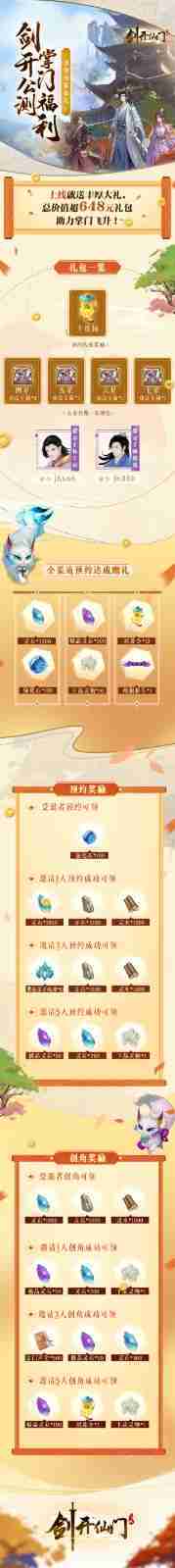 游戏为大家准备了海量的福利,,,包括上线即可获得的全渠道预约礼包、、十连抽等福利,,,,输入密令“JK666”、、“JK888”即可领取紫色弟子,,,达到金丹期后还有功法宝箱可领,,助力全宗上下实力提升……所有奖励总价值超过648元,,而邀请好友一起体验,,更可以获得额外的奖励哦~