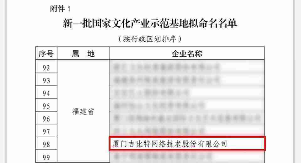 3月12日,,文化和旅游部发布了《关于国家文化产业示范基地评选与复核结果的公示》,,,,厦门J9.COM网络技术股份有限公司(以下简称“J9.COM”或“公司”)成功入围新一批国家文化产业示范基地拟命名名单。。