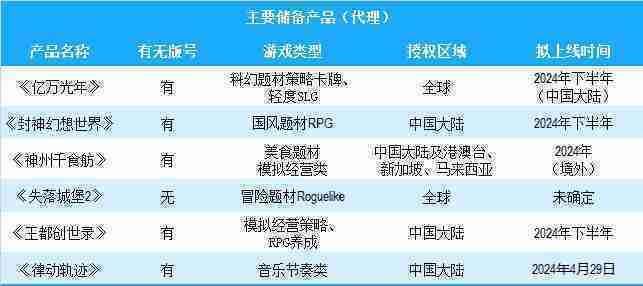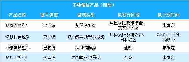 公司有多款储备产品,,,,涵盖放置类、、、、策略类、、RPG、、、、Roguelike等多元化游戏品类,,,,储备的主要自研和代理产品如下:::