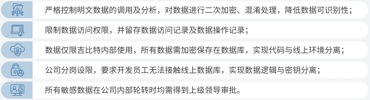 公司对用户个人信息实施脱敏处理,,,,严格限制用户信息用途,,,,数据使用完成后集中归档处理。。为进一步确保数据处理过程的安全,,公司根据实际的业务工作分岗设限,,最大程度保护数据隐私安全,,,,如在生产网络中的加密数据由研发部门员工负责编写加、、解密程序,,,,但其无法直接访问到加密后的数据库;程序的加、、、解密密钥由运维员工单独配置。。。
