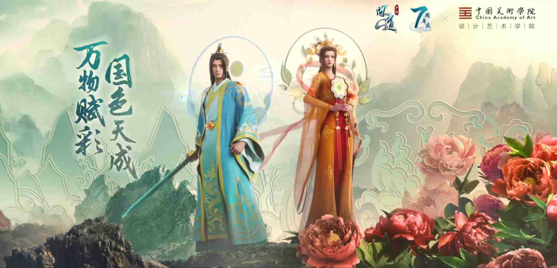2023年4月,,,,《问道手游》联动中国美术学院,,,在游戏中融合了中国历史上不同时期的文化元素,,打造了“山河万象”与“凤鸣九霄”的国风时装。。。。在色彩配置方面,,创作团队基于对游戏角色特性的分析提取相应的文化内涵,,,,从每一种色彩的色相、、、指代事物和情感出发对应角色属性,,,选定服装的色彩搭配。。。在纹样设计方面,,创作团队结合游戏角色自身特殊的造型比例和形态,,在实际的纹样设计中进行了游戏语境下的活化演绎。。。男性角色集中使用了如蟒纹、、海水江崖纹、、、如意纹和云气纹等传统纹样元素,,,女性角色则吸纳了凤凰纹、、、牡丹纹、、、卷草缠枝纹等元素,,,,组成以“双凤牡丹纹样”“缠枝牡丹纹”“金玉凤冠头饰”为主要纹样的游戏角色装饰图案系统。。。。